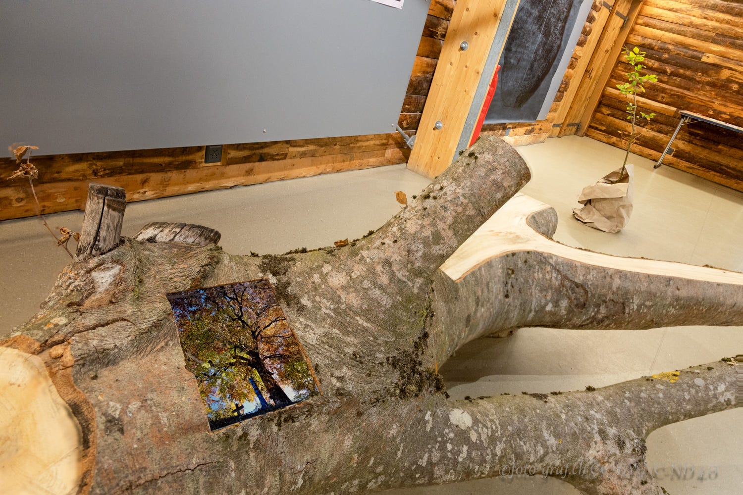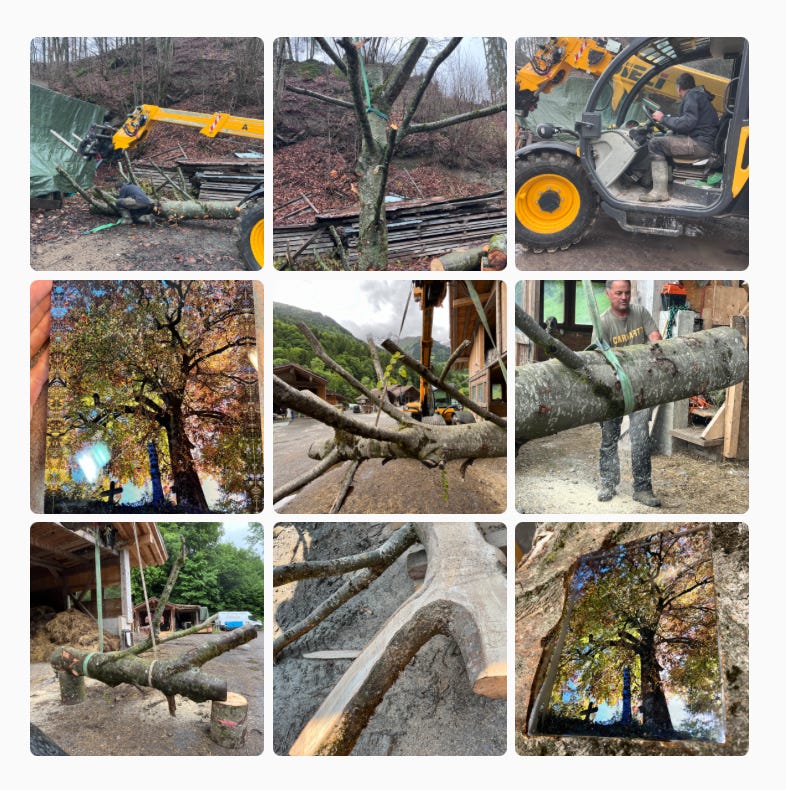 Laurent Es-Borrat (Scierie Mobile / Mobile woodworking, Val-d’Illiez, CH) can confirm I changed my mind at least a thousand times about how to carve it. An 800-kilo branch is literally not to be taken lightly!